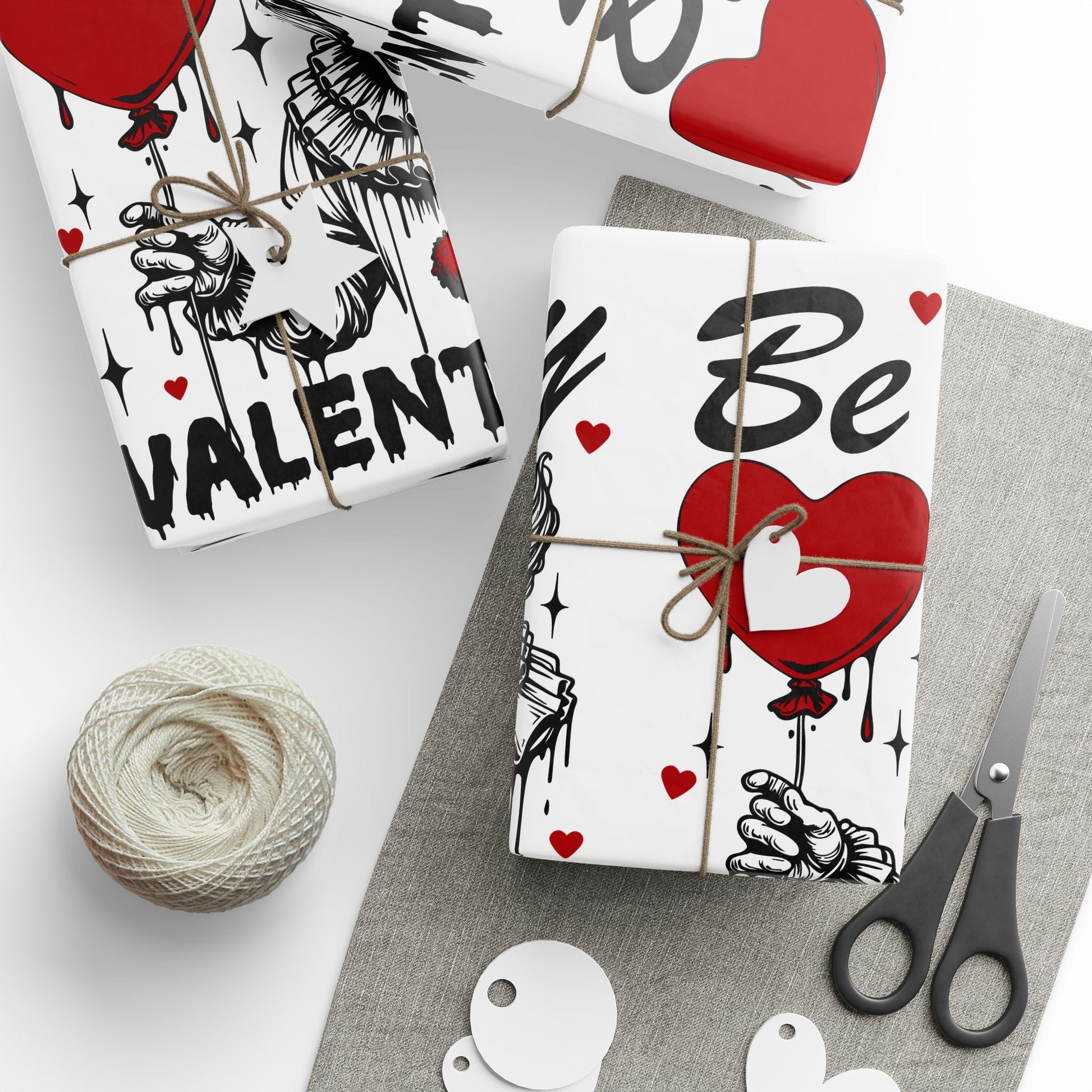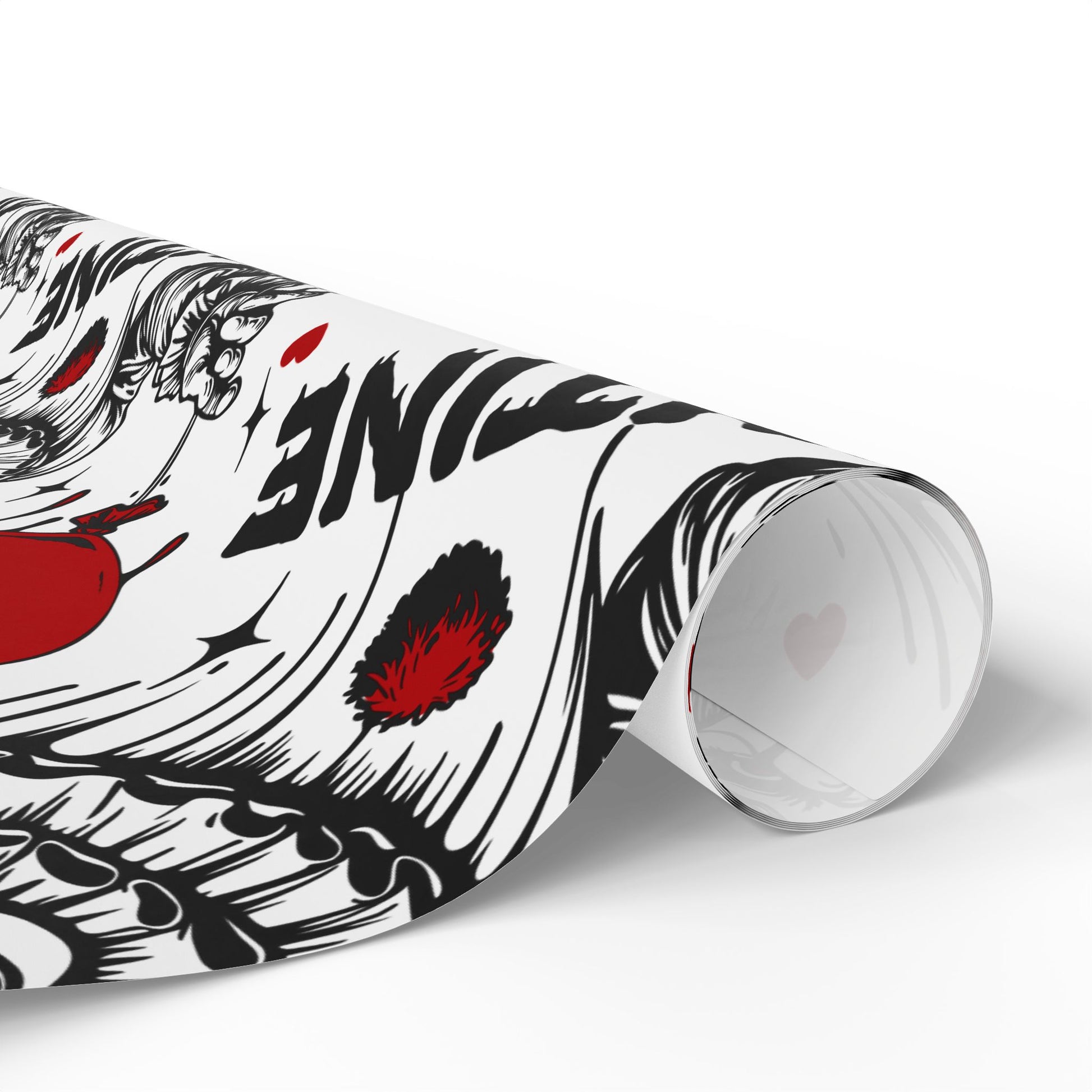 Hand-drawn horror-romance wrapping paper that turns ordinary gifts into a playful, slightly wicked moment. Bold black-and-white illustrations of a grinning clown clutching a heart appear across the sheet, while splashes of red punctuate the layout—hearts, drops, and the hand-lettered phrase “Be My Valentine.” The mood is tongue-in-cheek and a little dark: it feels like passing a secret love note across the room at midnight. Lightweight yet substantial, these continuous rolls let you wrap oversized items or create layered, dramatic presentations for Valentine’s gatherings, themed parties, or alternative wedding favors.