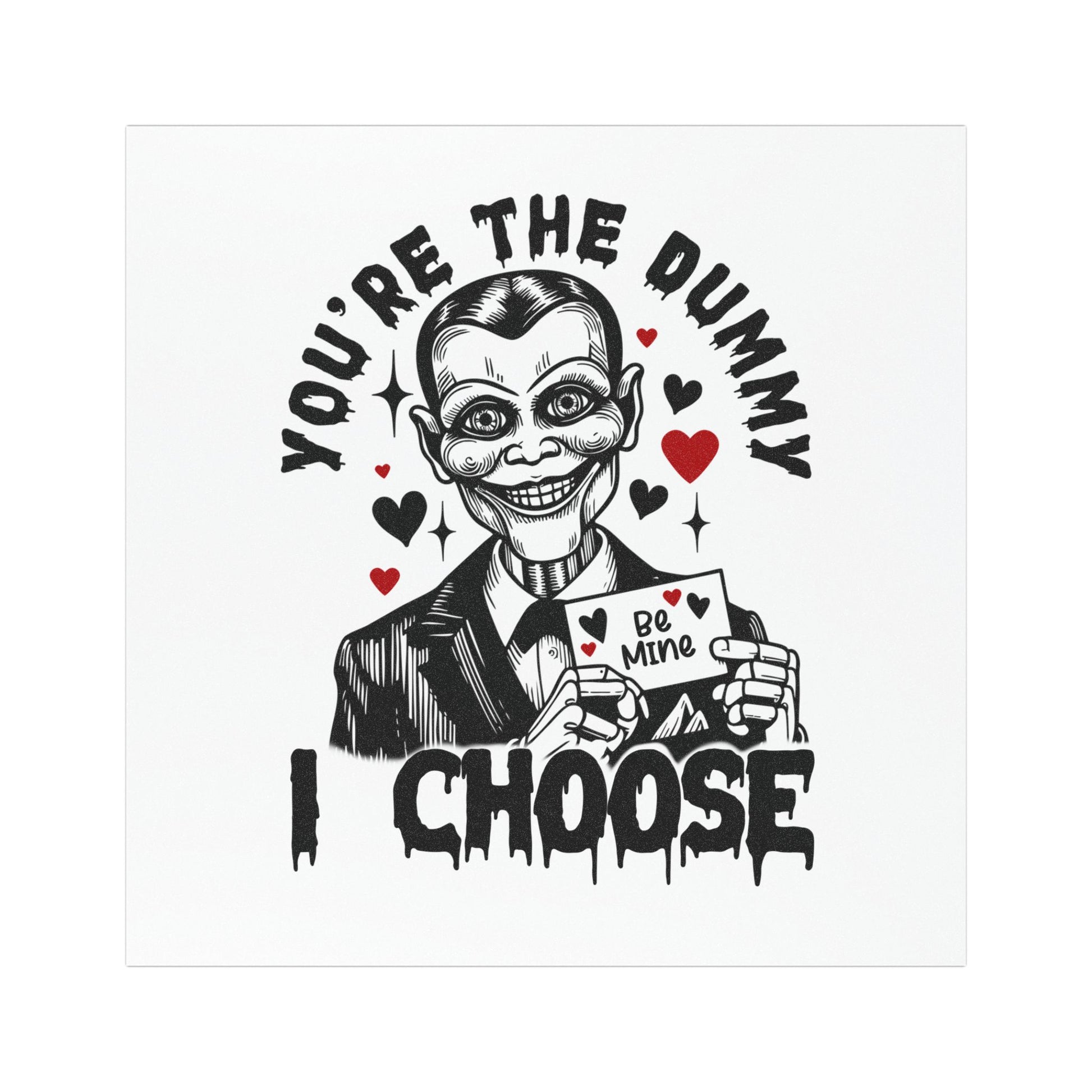 A bold vinyl car magnet that brings dark-humor charm to your ride. The artwork features a vintage ventriloquist-dummy style character holding a little “Be Mine” card, surrounded by dripping lettering and scattered hearts — a mix of creepy and playful that catches the eye. Matte-finish white vinyl sits over a strong black magnetic backing for easy attachment to metal surfaces and low-reflective visibility on the road. Weather-resistant printing and materials mean this magnet travels through rain, sun, and the daily grind without losing its attitude. Sized options let you pick a subtle accent or a statement piece for bumpers, trunks, or doors.