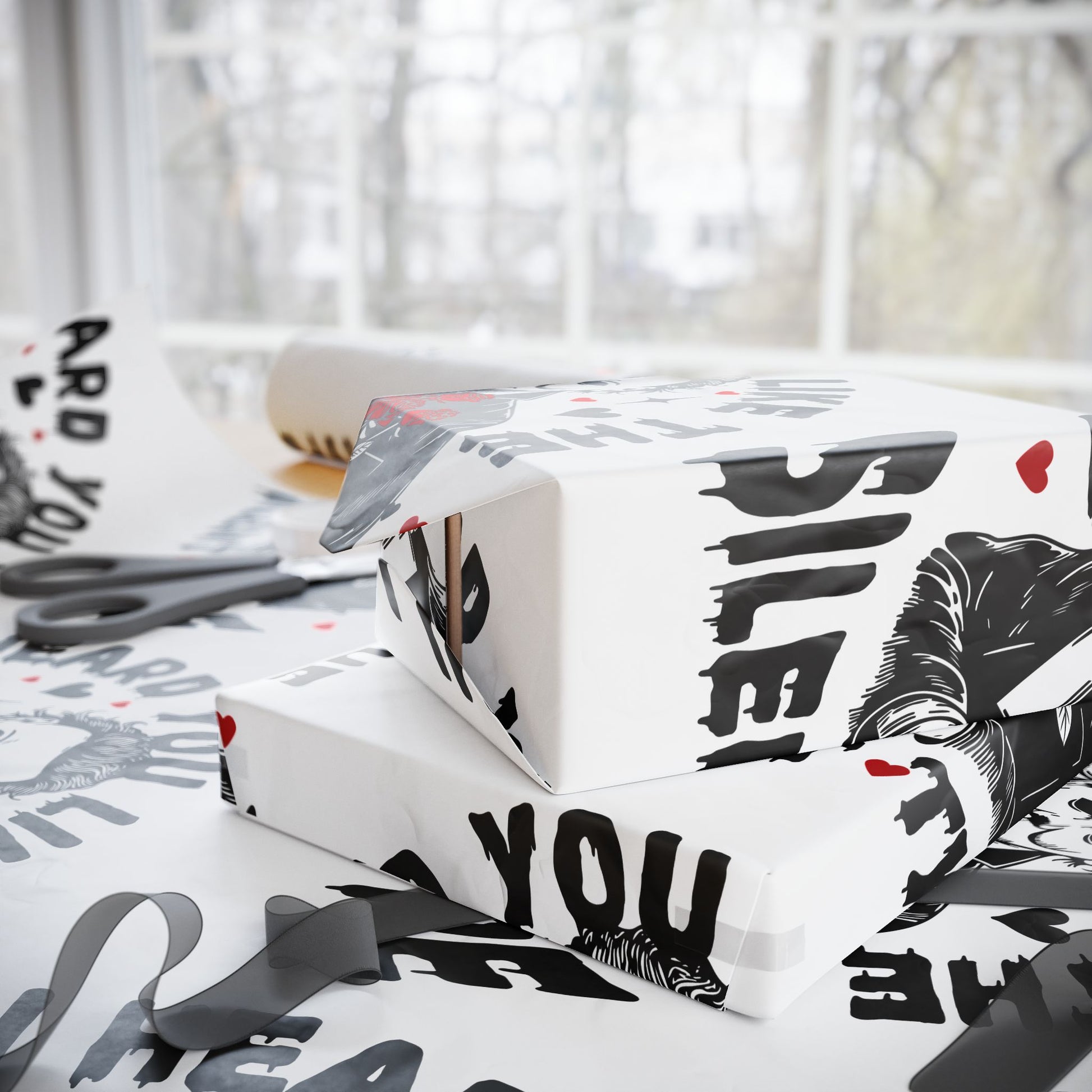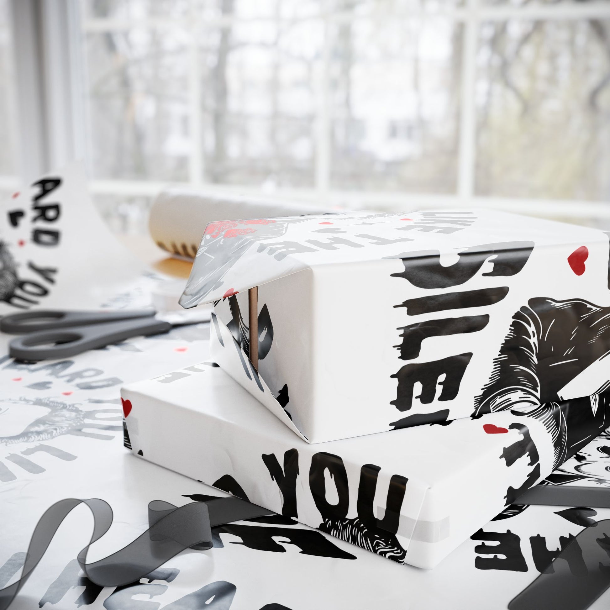 Make gift-giving a little wicked with this striking printed wrapping paper. The bold, high-contrast illustration repeats across the sheet in crisp black and red on a clean white background, bringing a darkly playful edge to birthdays, horror-movie nights, or themed parties. The paper lies smooth for easy folding and tapes cleanly — use the glossy option for a punchy shine, or choose matte for a more tactile, artful finish. It’s sized to wrap small to large packages, and the one-sided print keeps the reverse clean for neat edges and professional-looking presentation. A subtle white trim with a production barcode appears along the sheet edge.