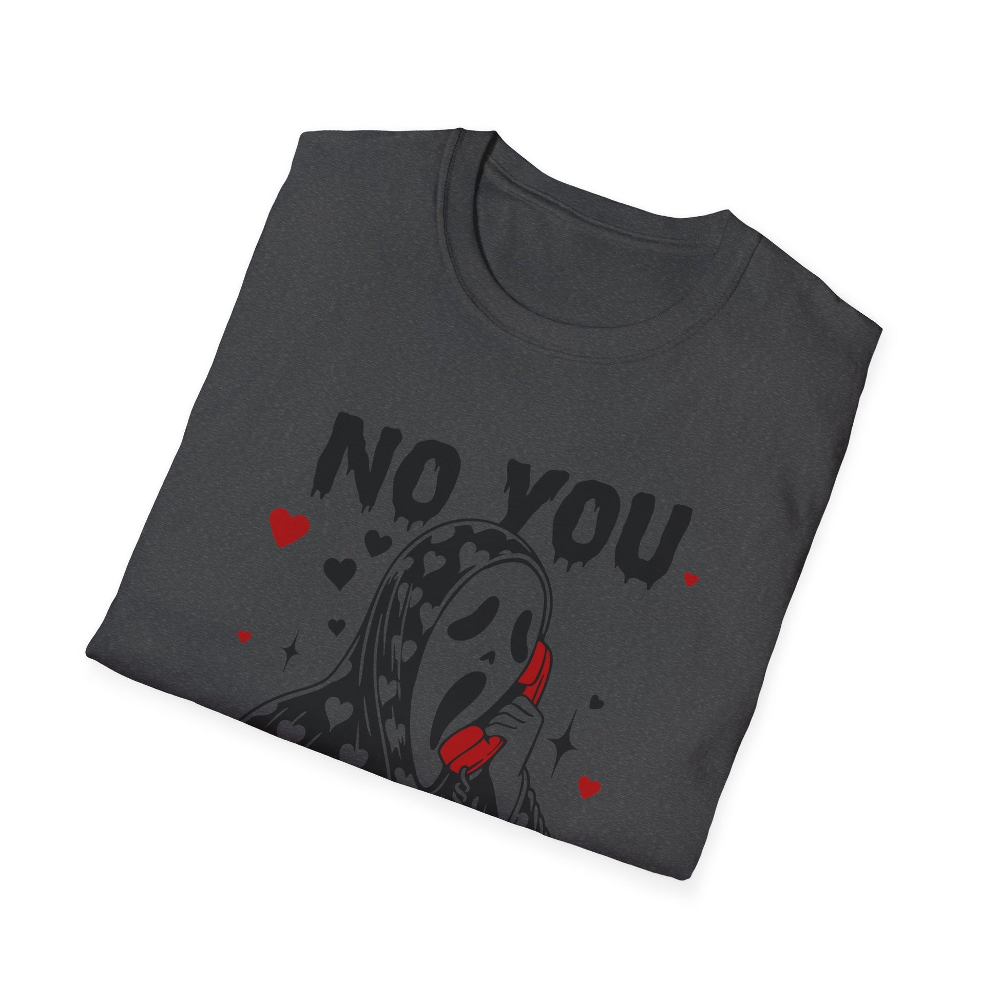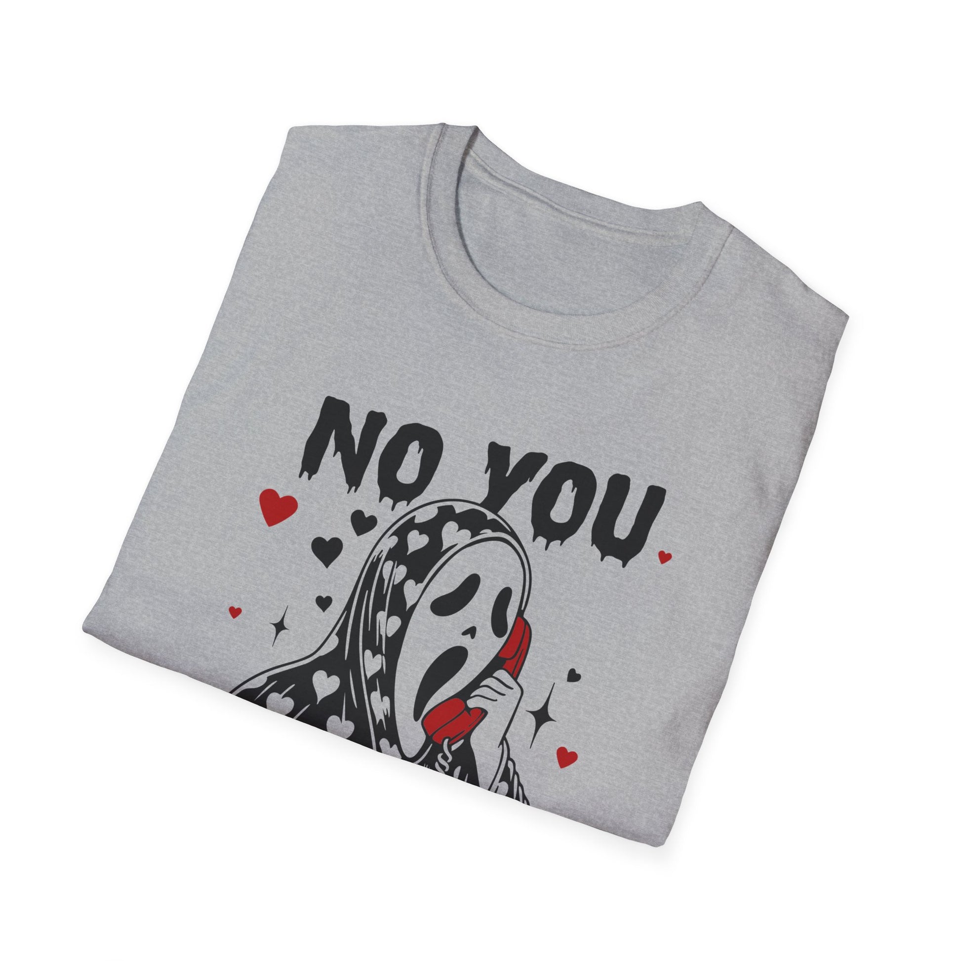 This lightweight cotton tee carries a playful, slightly dark sense of humor — a ghostly figure in a heart-speckled hoodie holding a red phone, framed by the bold words “NO YOU.” and a handwritten “Hang Up.” It reads as a wink to anyone who enjoys offbeat, ironic graphics and quick-witted streetwear. The soft, breathable fabric drapes cleanly and holds print detail sharply, so the artwork stays vivid through everyday wear. Wear it when you want to make people smile (or double-take) — whether you’re grabbing coffee, heading to a casual hangout, or layering under a jacket for a night out. The honest, slightly sardonic tone of the design fits wardrobes that skew clever, cozy, and a little bit spooky.