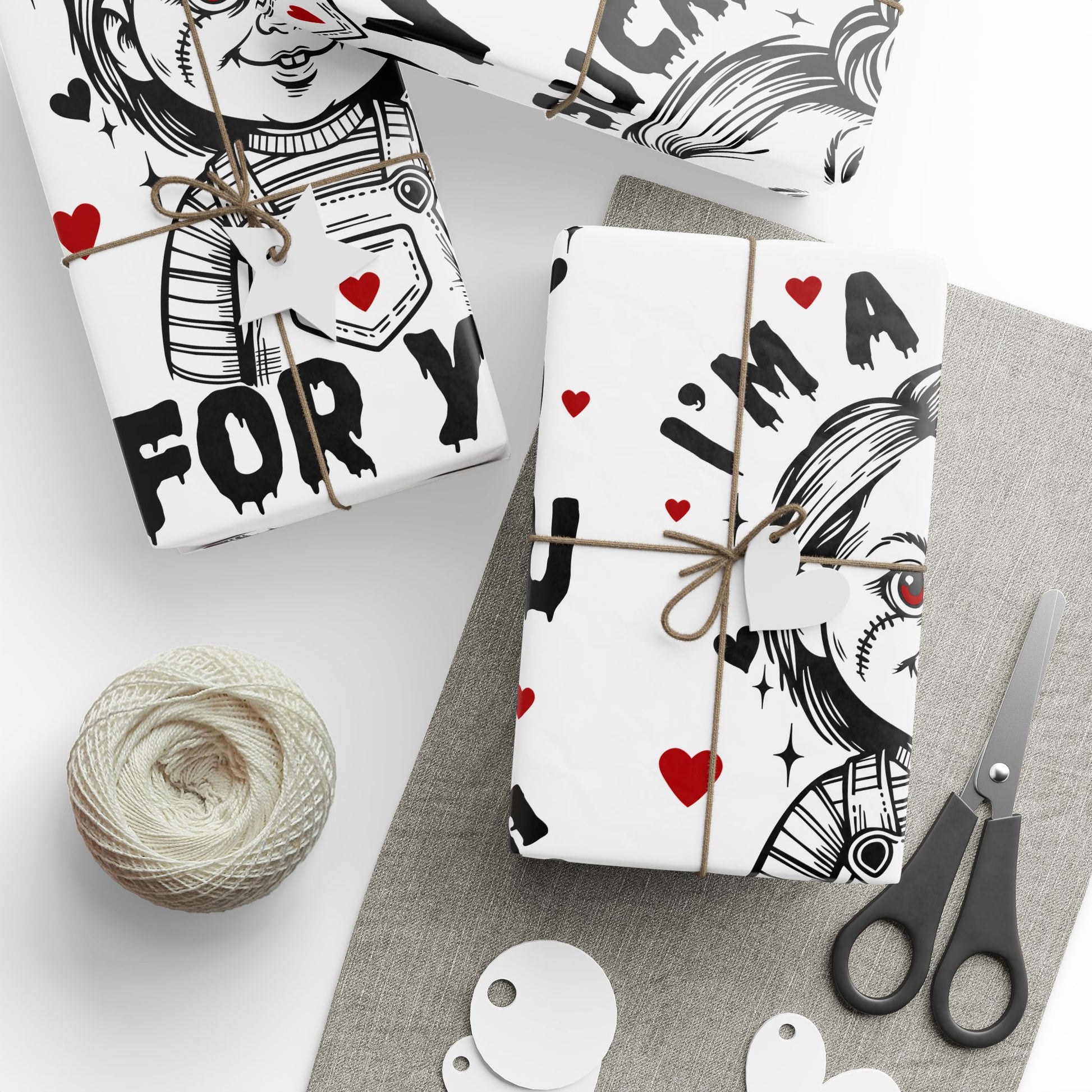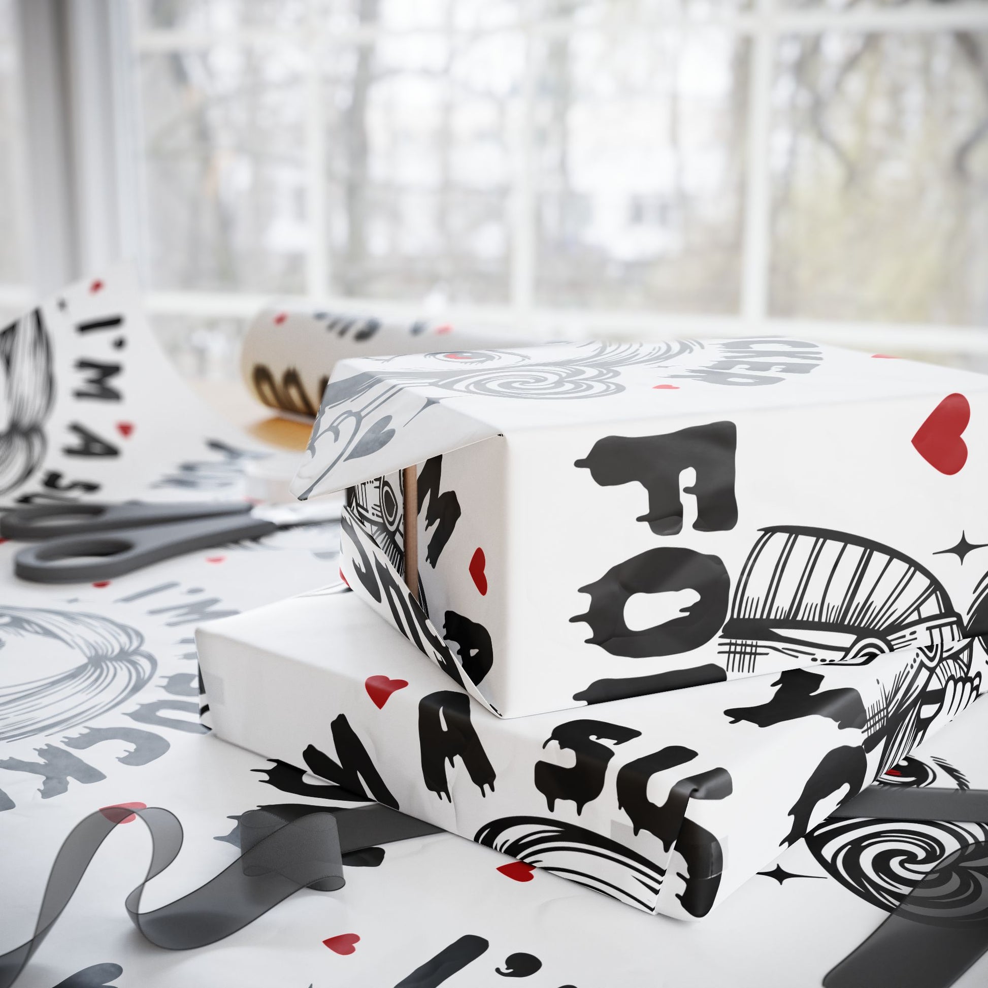 This illustrated wrapping paper carries a playful, slightly mischievous energy—hand-drawn faces, bold brush lettering that reads “I’m a sucker for you,” and tiny red hearts scattered through the repeat pattern. The monochrome sketch lines give it a vintage, tattoo-inspired look while the red accents add flirtatious warmth. Roll it out for Valentine’s Day packages, cheeky anniversary surprises, or to wrap a small token for someone who loves retro, subversive charm. The one-sided print on sturdy fine-art paper holds creases well and presents that graphic artwork with crisp contrast whether you choose glossy or matte.