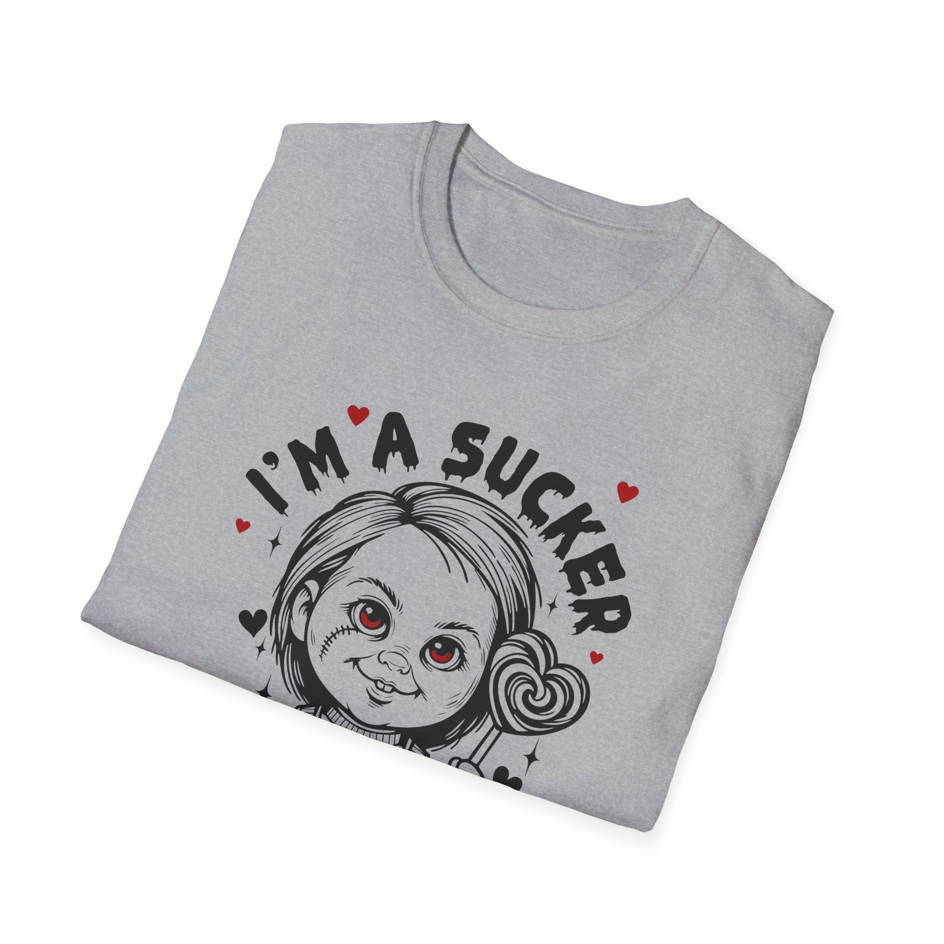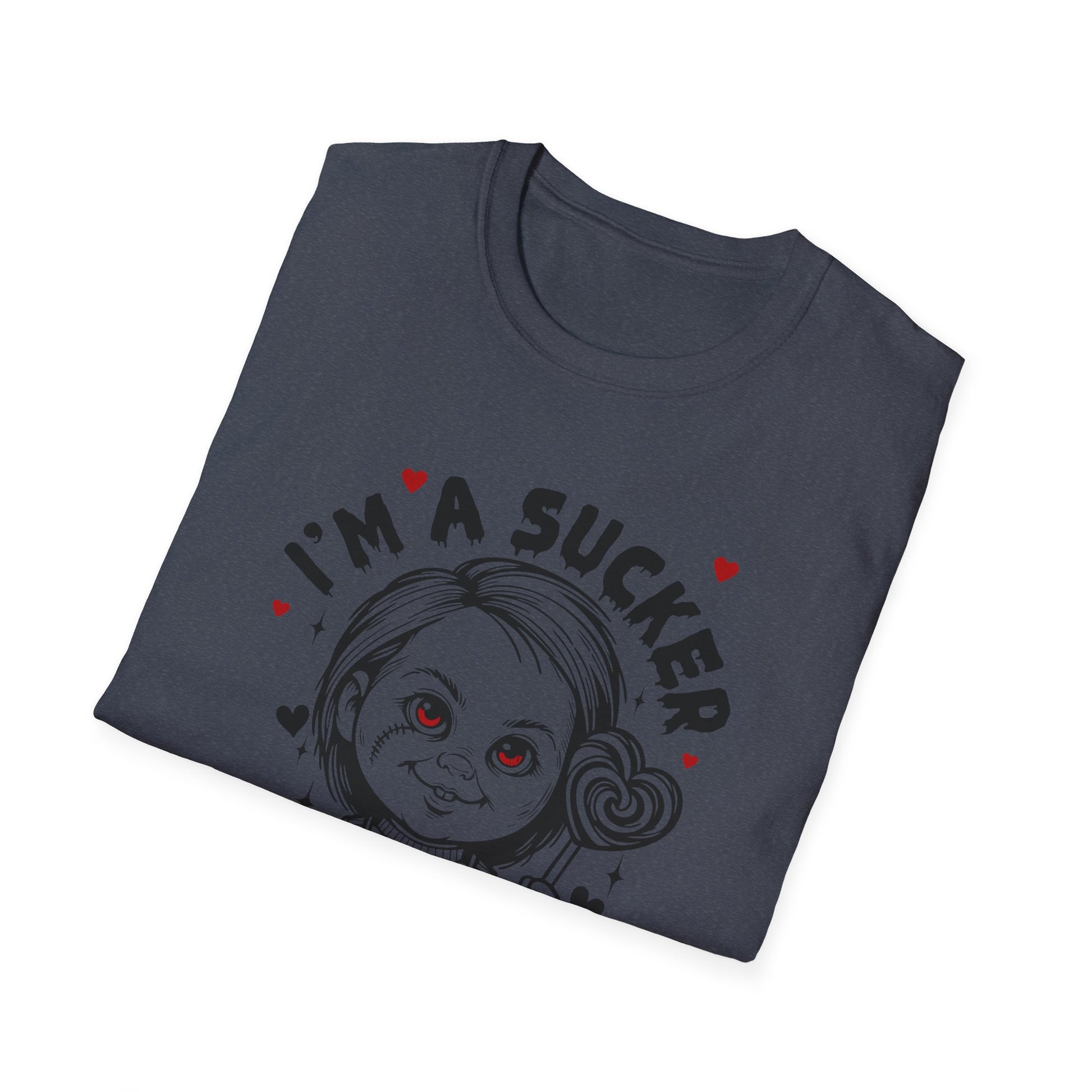 Soft, lightweight tee with a playful, slightly spooky illustration that mixes childhood innocence and cheeky romance. The front print shows a wide-eyed doll holding a swirled lollipop with the caption “I’m a sucker for you,” accented by tiny hearts. Wear it to add a touch of darkly sweet humor to casual days — layered under a jacket for city strolls, paired with jeans for relaxed hangouts, or worn while handing out candy at themed parties. The smooth, durable cotton takes prints beautifully so the detailed linework and subtle red accents stay crisp. Breathable and comfortable, it feels lived-in from the first wear while still holding its shape after washes.