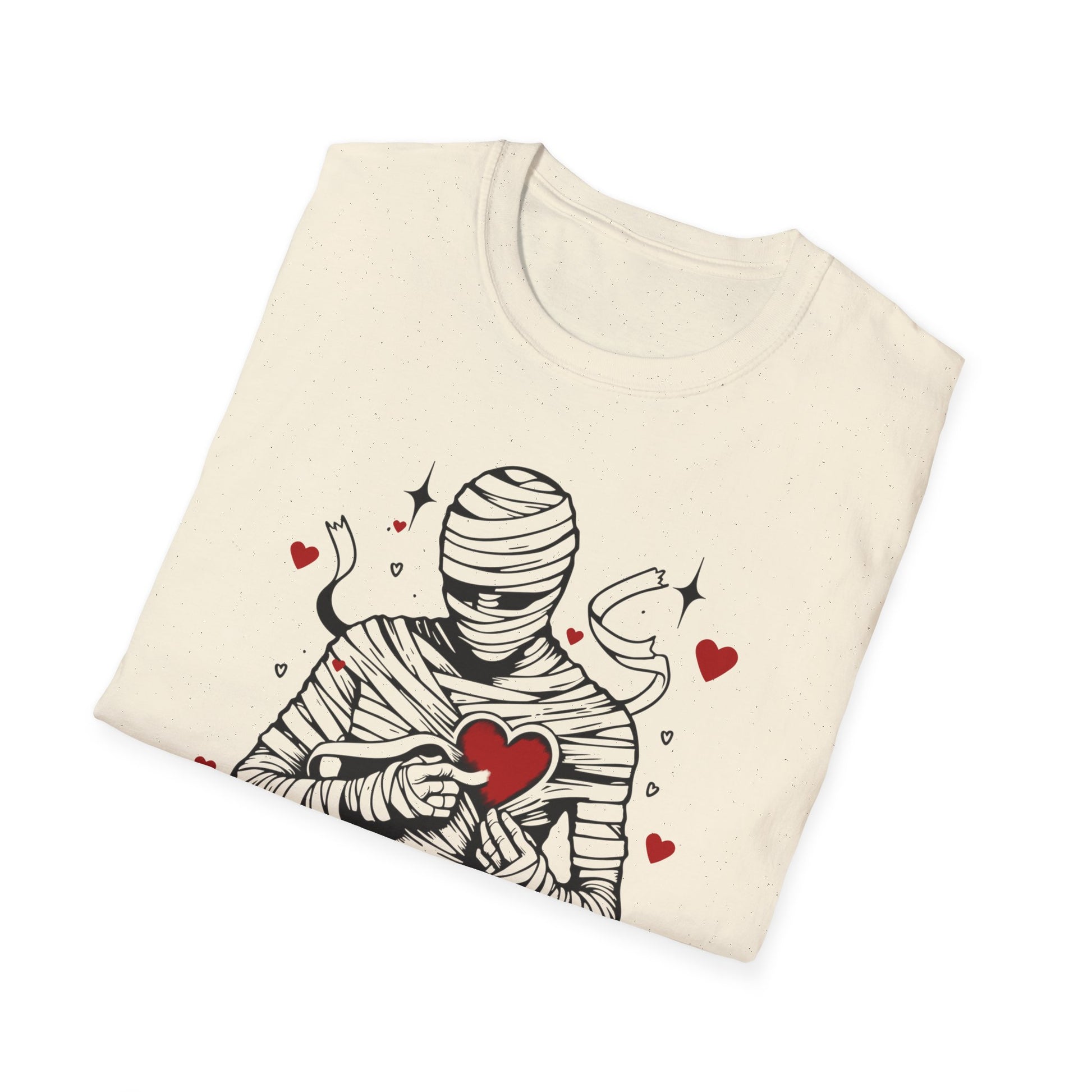 This lightweight cotton tee carries a playful, slightly spooky charm — a bandaged figure tenderly holding a bright red heart, surrounded by tiny hearts and the hand-lettered phrase “Wrapped Up In You.” Soft against the skin, the shirt drapes cleanly with a classic crew neckline and a straight, comfortable fit. Wear it to show a cheeky, affectionate side during Halloween events, romance-themed gatherings, or casual days when you want to mix humor with heart. The simple palette keeps the design bold and wearable, whether layered under a jacket or worn on its own.