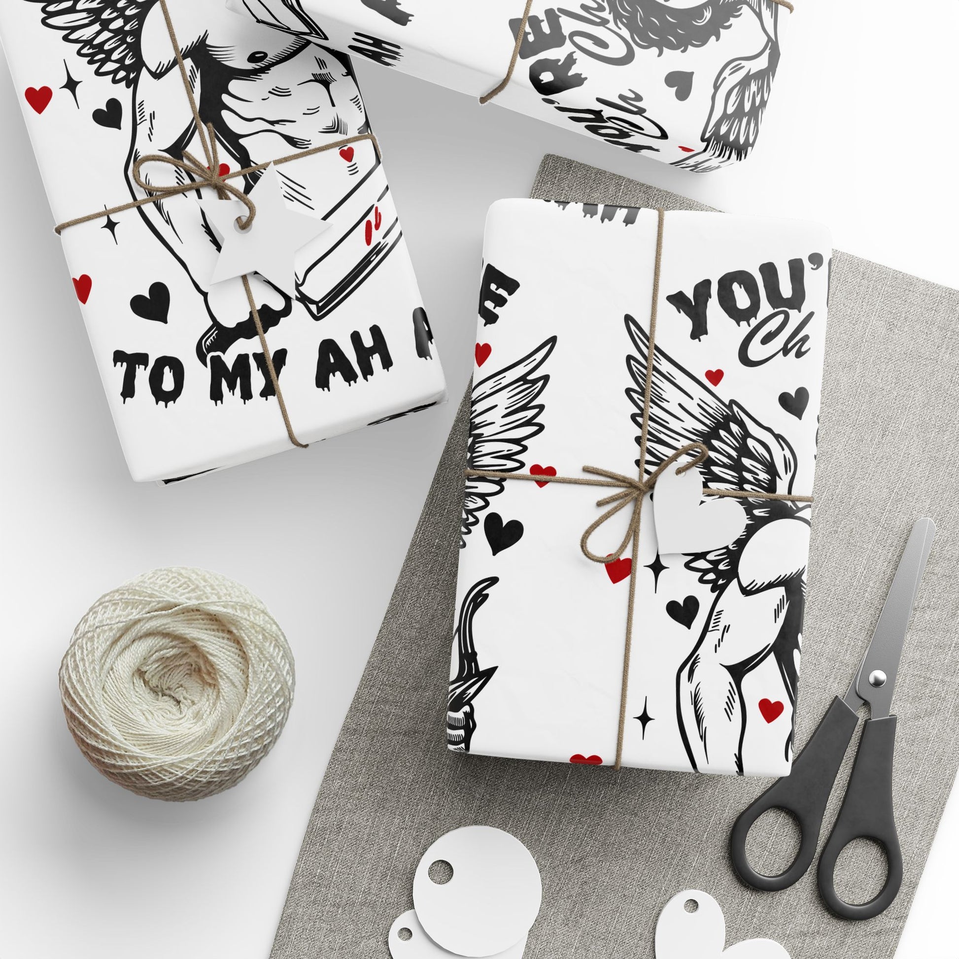 Hand-illustrated cherubs in bold black ink with tiny red hearts repeat across premium wrapping paper, bringing a playful, slightly rebellious twist to romantic moments. The high-definition print keeps every line crisp — from feathered wings to cheeky lettering — and the choice of glossy or matte finish lets you tailor the mood: glossy for vibrant shine, matte for soft, artful understatement. Large format options accommodate small boxes or long parcels, and the one-sided print leaves the reverse clean and ready to fold.