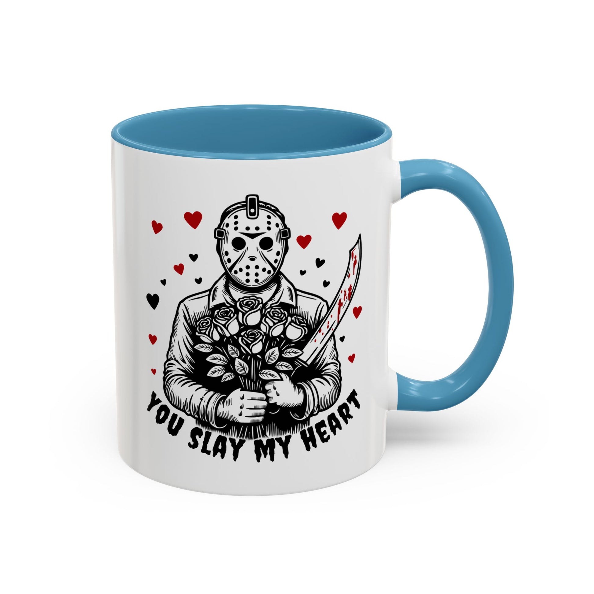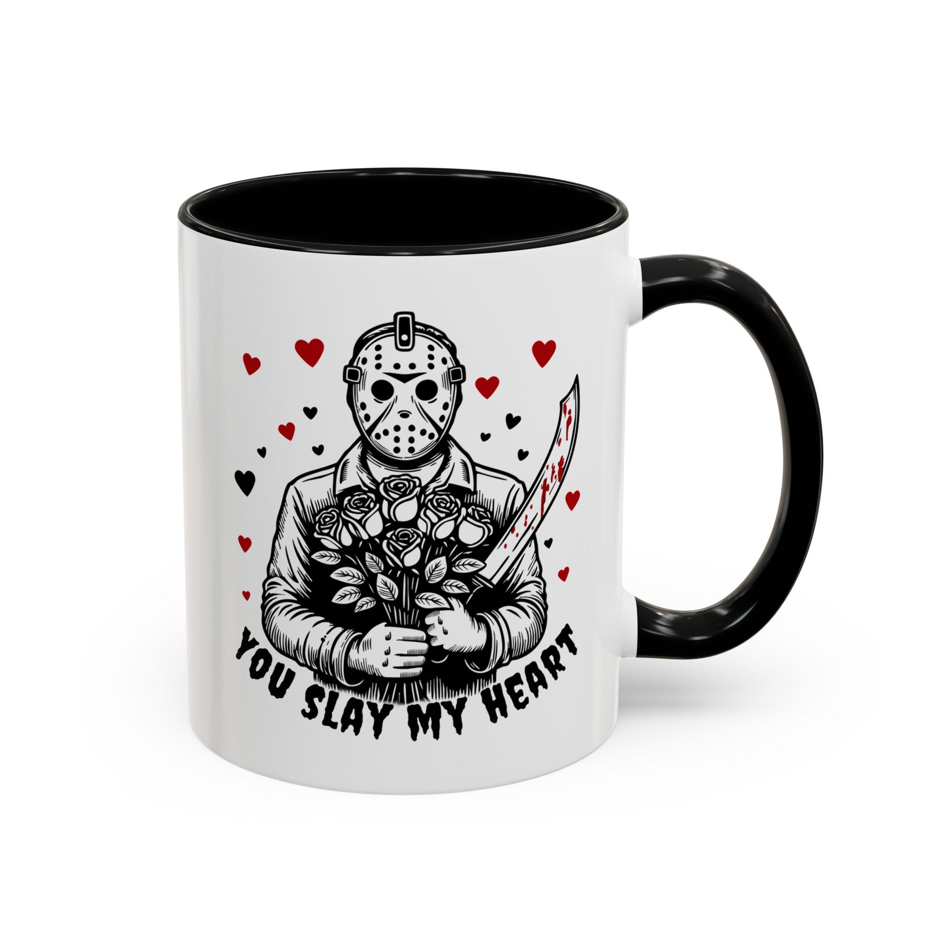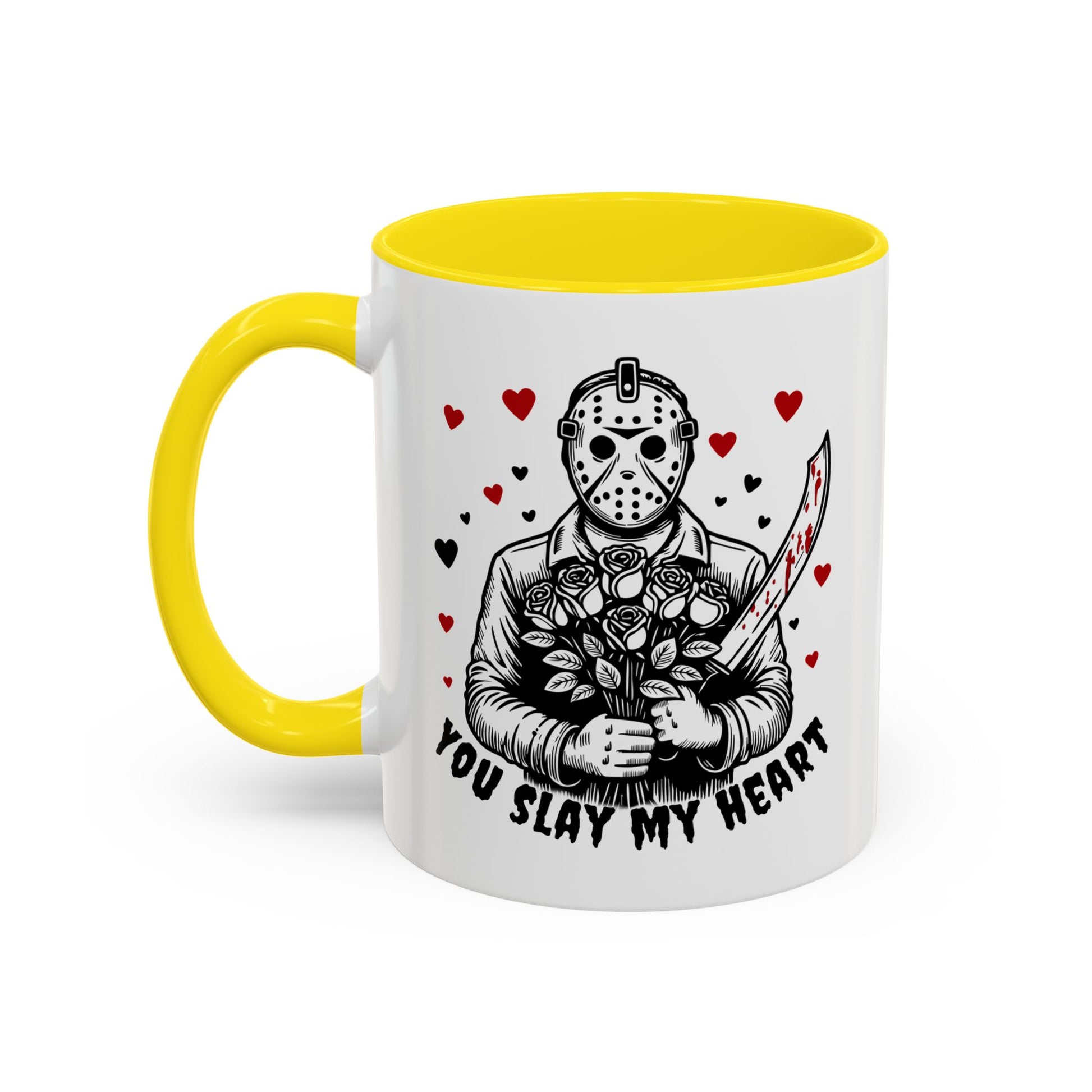 This glossy ceramic mug blends dark humor and sweet sentiment in one striking design. A masked figure holds a bouquet and a blood-splattered knife among drifting hearts, with the cheeky line “You Slay My Heart.” The colored interior and handle add a vivid contrast to the white exterior, making the artwork pop. It's sturdy enough for daily coffee or late-night cocoa and cleans easily in the dishwasher or reheats in the microwave. Gift it to a fellow horror fan, keep it on your desk to spark smiles, or bring it out at themed gatherings for a playful, slightly wicked touch.