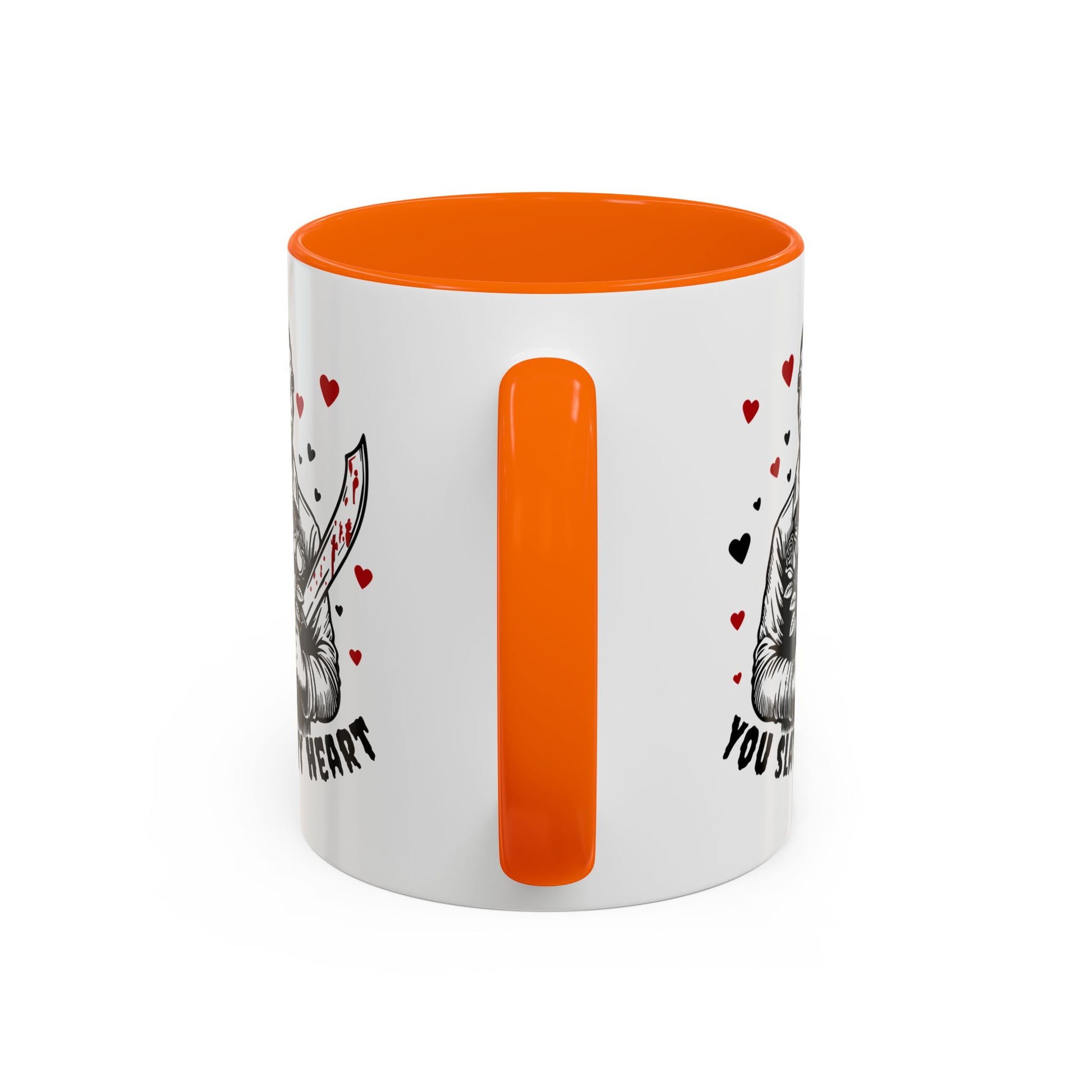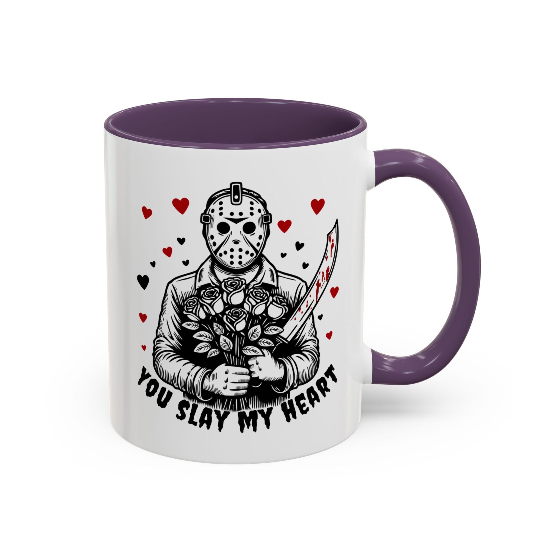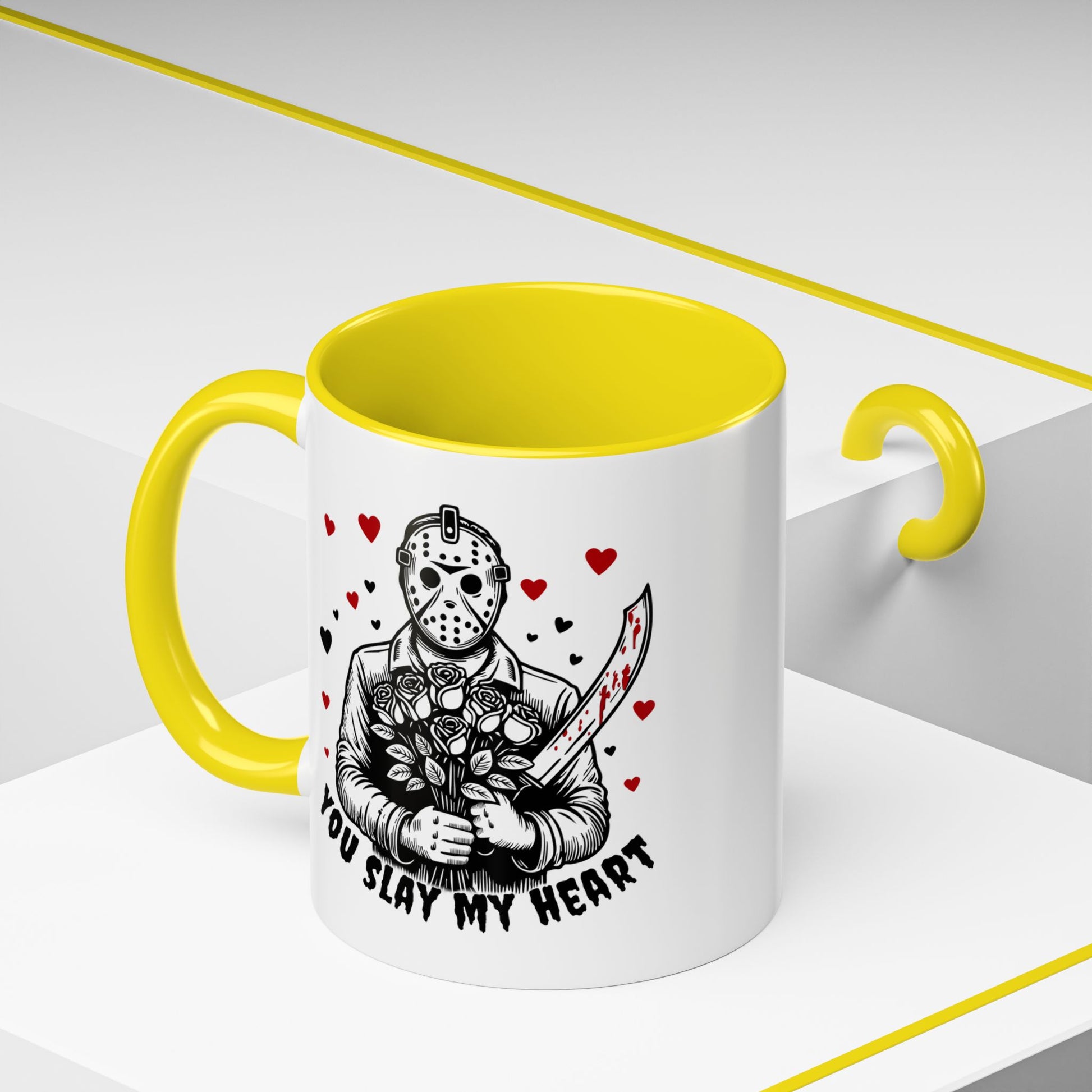 This glossy ceramic mug blends dark humor and sweet sentiment in one striking design. A masked figure holds a bouquet and a blood-splattered knife among drifting hearts, with the cheeky line “You Slay My Heart.” The colored interior and handle add a vivid contrast to the white exterior, making the artwork pop. It's sturdy enough for daily coffee or late-night cocoa and cleans easily in the dishwasher or reheats in the microwave. Gift it to a fellow horror fan, keep it on your desk to spark smiles, or bring it out at themed gatherings for a playful, slightly wicked touch.