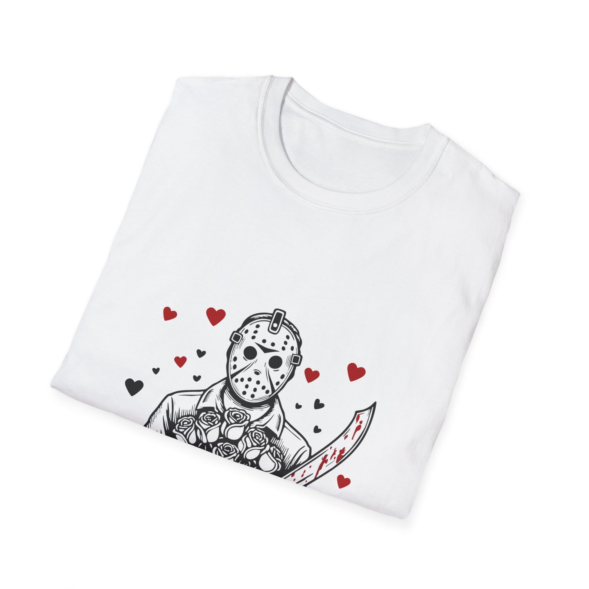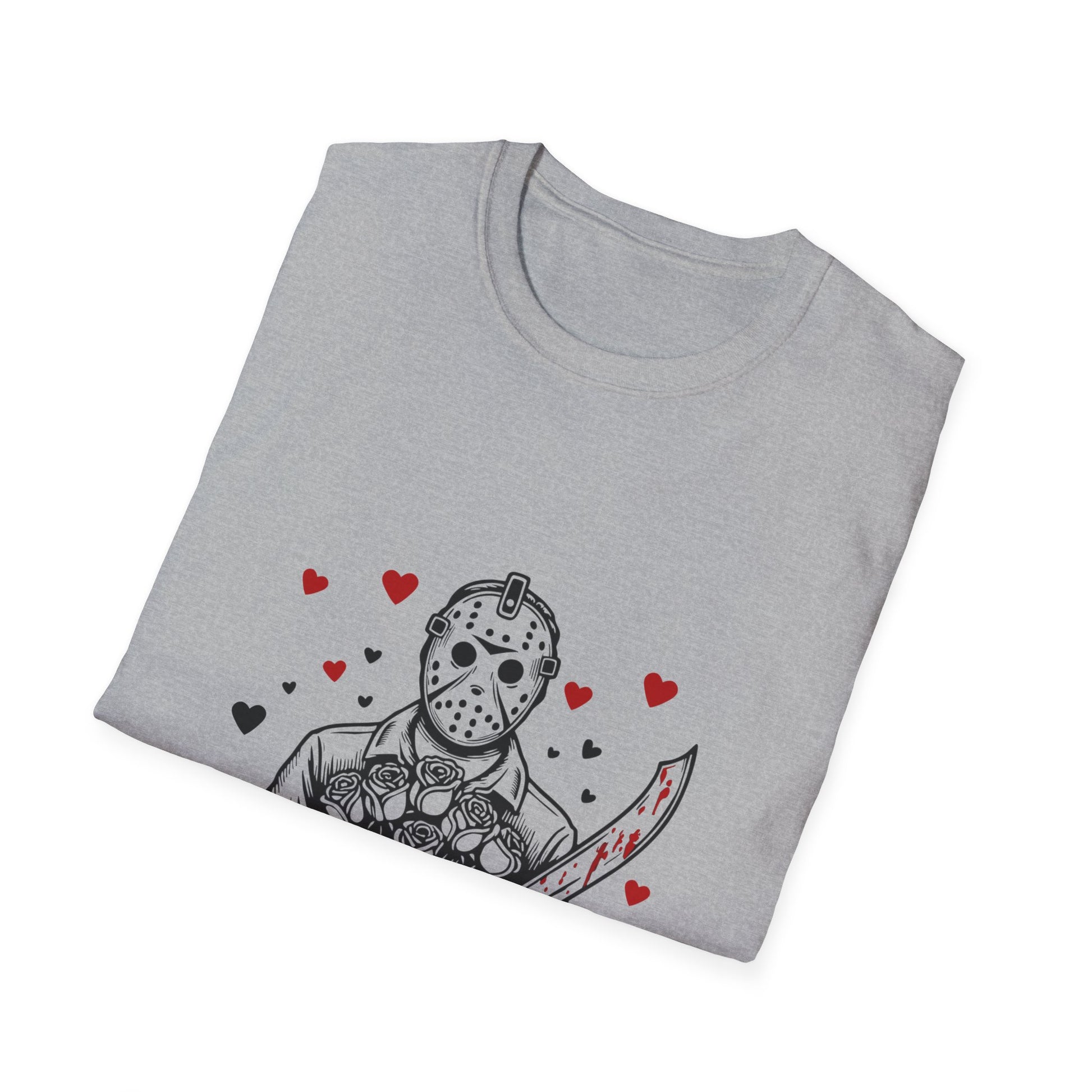 This lightweight cotton tee blends playful darkness with warm humor — a masked horror icon holding a bouquet, tiny hearts drifting around and the cheeky line “You Slay My Heart.” It feels like a wink from someone who loves campy scares and offbeat romance. The simple crew neck and classic fit make it easy to wear layered under a jacket or styled with jeans for late-night movie marathons, conventions, or casual outings where your taste for dark humor can shine. The soft fabric and tear-away label keep it comfortable for all-day wear while the detailed print holds its character wash after wash.